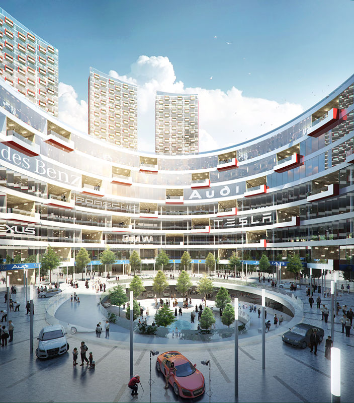 項目打造了讓人心動(dòng)的三個(gè)主題中心:高端大氣的汽車(chē)博覽中心展場(chǎng),位于寺瓦路入口層的中心商圈處,巧妙的通過(guò)坡道聯(lián)系地下的展示空間,成為集聚人氣、立體車(chē)展、新聞發(fā)布、汽車(chē)拍賣(mài)等活動(dòng)的極佳場(chǎng)所,在該處對中心商圈的內圈展示界面一覽無(wú)余,強烈的空間圍合感,激發(fā)身在其中的人們君臨天下的聯(lián)想。